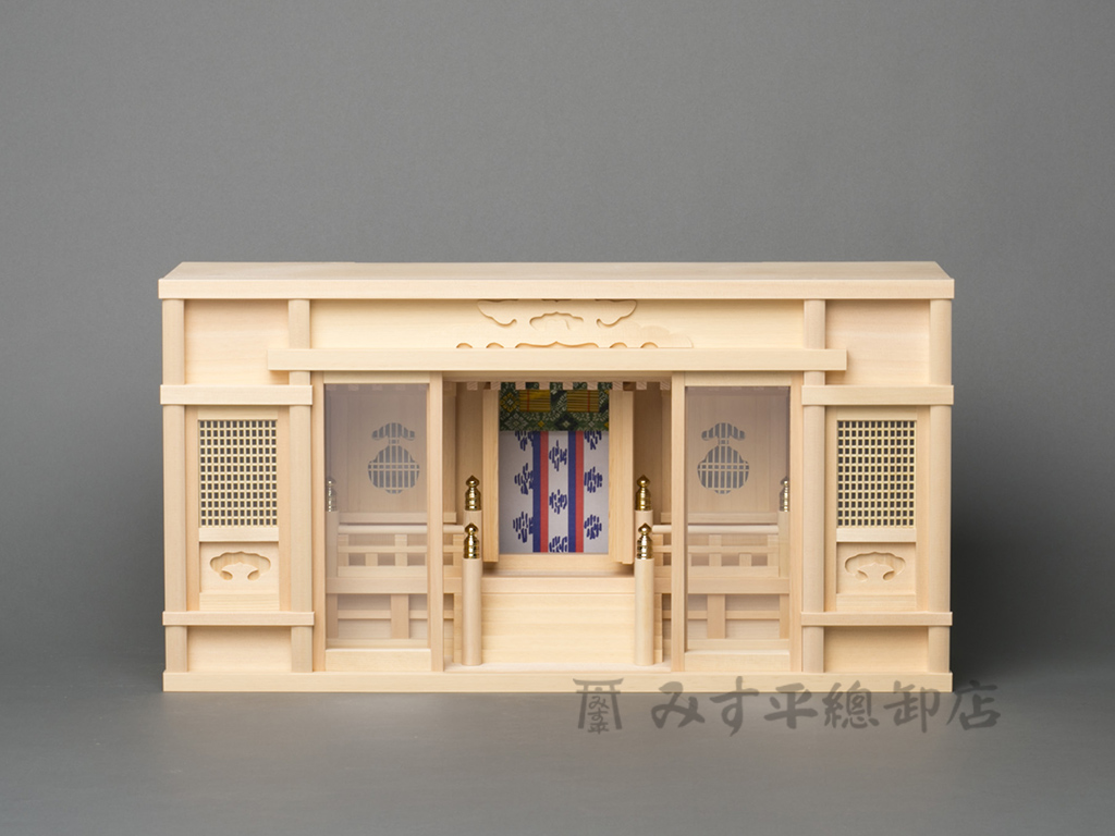 木曽桧(見附桧)造りです(見附桧・背部等一部を除きます)。扉のデザインは唐戸(からと)でご用意しました。デザインからくるサイズの関係で一枚扉となっておりますがれっきとした三社宮ですのでお札を並べてお祀り出来ます。